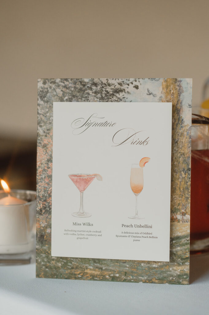 To complement the rococo-inspired design, our team created all of the stationery, including menus, signage, and the seating chart. Their menus and invitations featured hand-drawn illustrations of Langdon Hall’s iconic architecture. Their seating chart featuring a large printed rococo-era artwork. The bespoke stationery tied the design together beautifully, offering guests an artful keepsake of the celebration.